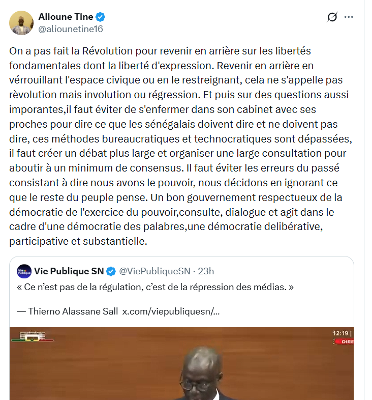 Tout est parti d’un post de Alioune Tine, reprenant une vidéo de l’opposant Thierno Alassane Sall, pour fustiger la création du Conseil national de Régulation des Médias (CNRM) en lieu et place du CNRA. « On n’a pas fait la Révolution pour revenir en arrière sur les libertés fondamentales dont la liberté d’expression. Revenir en arrière en verrouillant l’espace civique ou en le restreignant, cela ne s’appelle pas révolution mais involution ou régression (…) Un bon gouvernement respectueux de la démocratie de l’exercice du pouvoir, consulte, dialogue et agit dans le cadre d’une démocratie des palabres, une démocratie délibérative, participative et substantielle », écrit notamment le membre de la société civile.