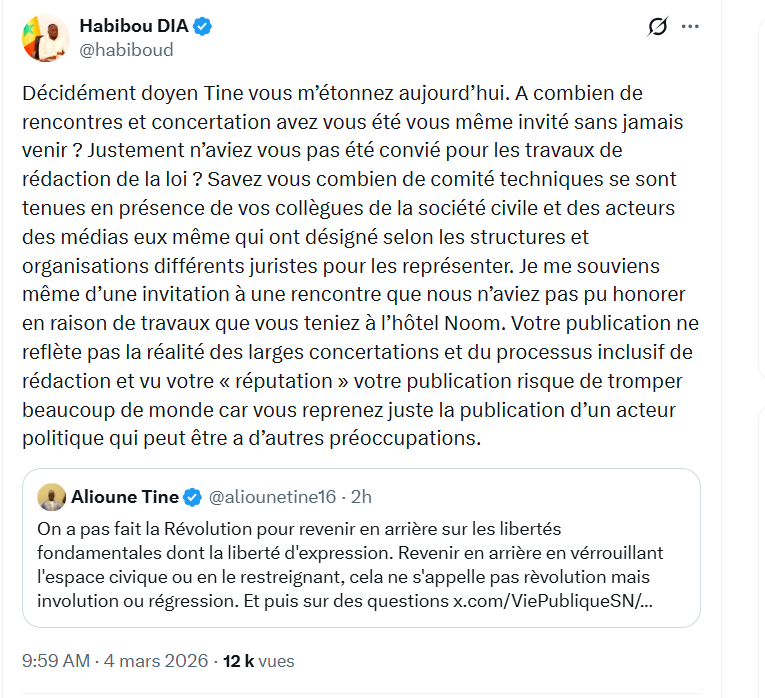 Un postulat pas du tout partagé par Habibou Dia, qui le lui a fait savoir sur X. « Décidément doyen Tine vous m’étonnez aujourd’hui. A combien de rencontres et concertation avez-vous été vous même invité sans jamais venir ? Justement n’aviez vous pas été convié pour les travaux de rédaction de la loi ? Je me souviens même d’une invitation à une rencontre que vous n’aviez pas pu honorer en raison de travaux que vous teniez à l’hôtel Noom. Votre publication ne reflète pas la réalité des larges concertations et du processus inclusif de rédaction et vu votre « réputation » votre publication risque de tromper beaucoup de monde car vous reprenez juste la publication d’un acteur politique qui peut être a d’autres préoccupations », lui reproche le directeur de la comm’ au ministère de la Communication, des Télécommunications et du Numérique.