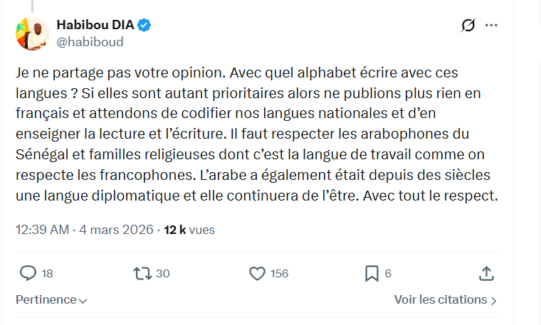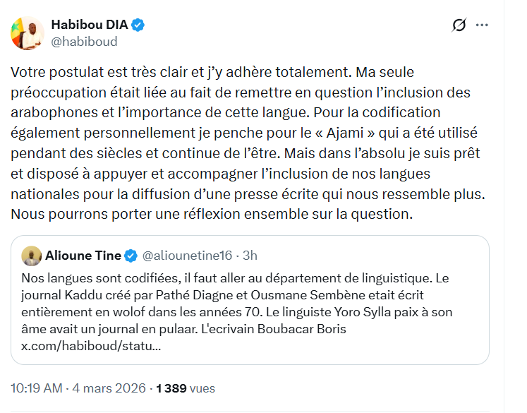 Sur le réseau social X, Alioune Tine a jugé qu’une édition dans nos langues nationales aurait dû primer sur l’arabe. « La version wolof , peule , serere ou joola était prioritaire », écrit Alioune Tine. « Avec quel alphabet écrire avec ces langues ? Si elles sont autant prioritaires alors ne publions plus rien en français et attendons de codifier nos langues nationales et d’en enseigner la lecture et l’écriture. Il faut respecter les arabophones du Sénégal et familles religieuses dont c’est la langue de travail comme on respecte les francophones. », lui répond Habibou Dia.