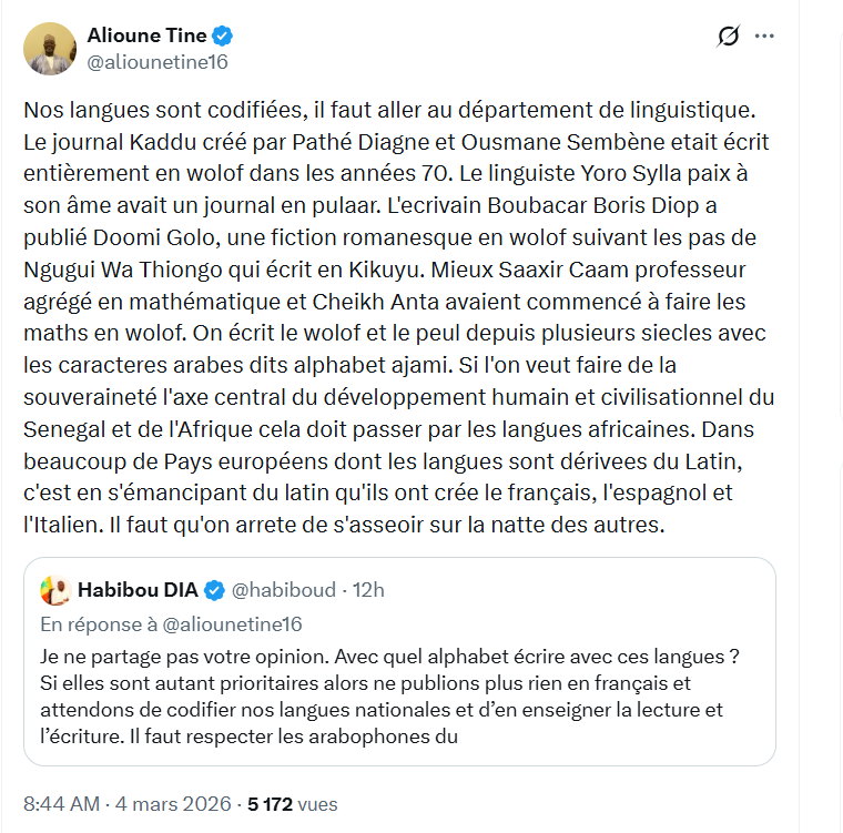 La passe d’arme ne s’arrête pas là, puisque Alioune Tine va revenir à la charge. « Nos langues sont codifiées, il faut aller au département de linguistique.(…) On écrit le wolof et le peul depuis plusieurs siècles avec les caractères arabes dits alphabet ajami. Si l’on veut faire de la souveraineté l’axe central du développement humain et civilisationnel du Sénégal et de l’Afrique cela doit passer par les langues africaines », ajoute-t-il.