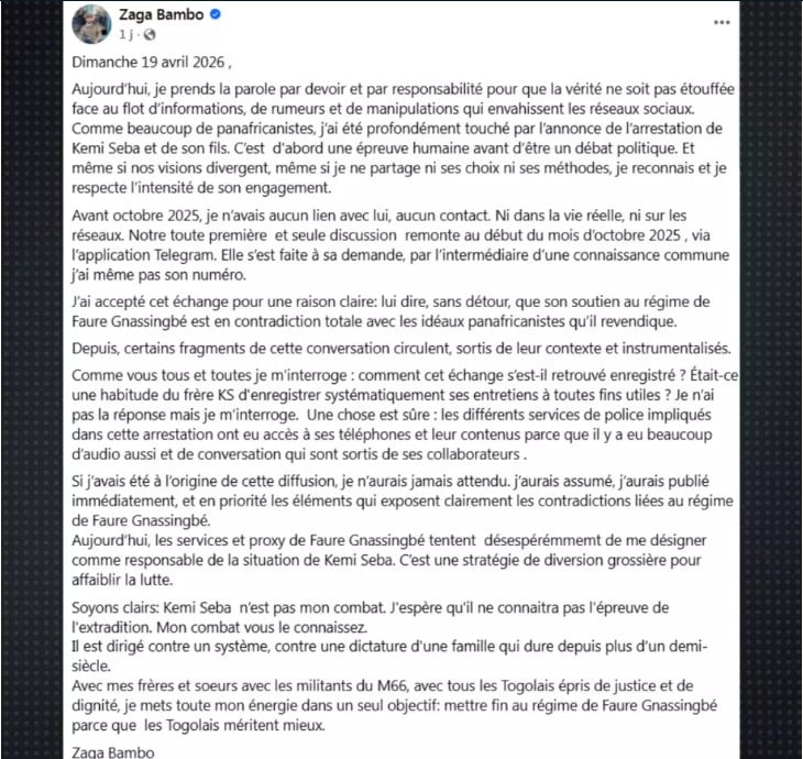 Se disant « profondément touché par l’arrestation de Kemi Seba », Zaga Bambo a toutefois affirmé n’avoir jamais eu « aucun lien » avec le militant panafricaniste. Le chanteur déclare avoir accepté de discuter avec lui après que Kemi Seba l’a contacté, mais pour dénoncer son discours sur le Togo et lui dire « que son soutien au régime de Faure Gnassingbé est en contradiction totale avec les idéaux panafricanistes qu’il revendique. »