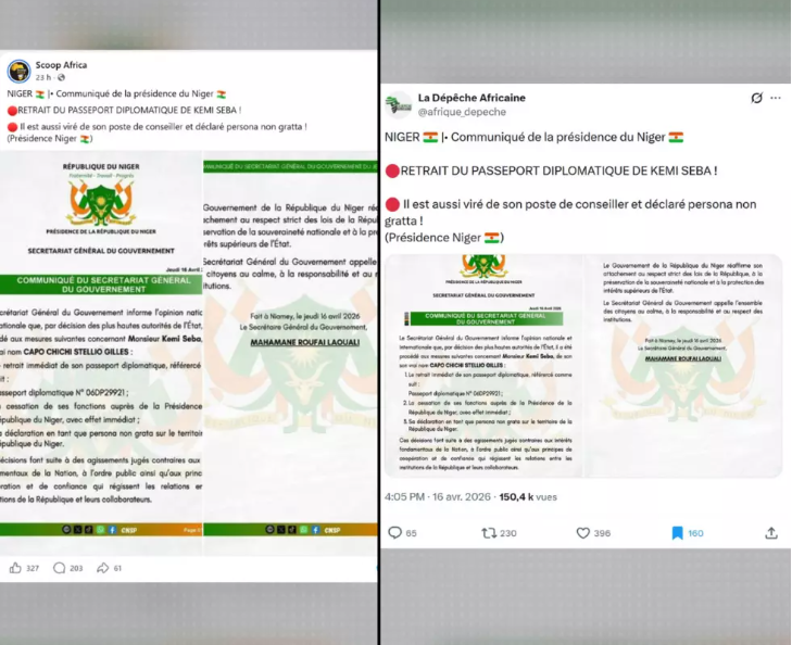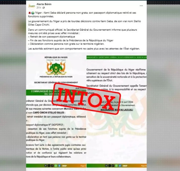 Quelques heures après la diffusion de ces audios, ces documents ont été instrumentalisés par des comptes opposés au militant panafricaniste. Diffusé par de nombreux comptes anti-AES sur X et Facebook, un faux communiqué des autorités nigériennes a, par exemple, fait croire que la junte nigérienne, officiellement appelée Conseil national pour la sauvegarde de la patrie (CNSP), avait retiré le passeport diplomatique de Kemi Seba et mis fin à ses fonctions de conseiller spécial auprès d’Abdourahamane Tiani après ses critiques contre l’AES et le Niger.