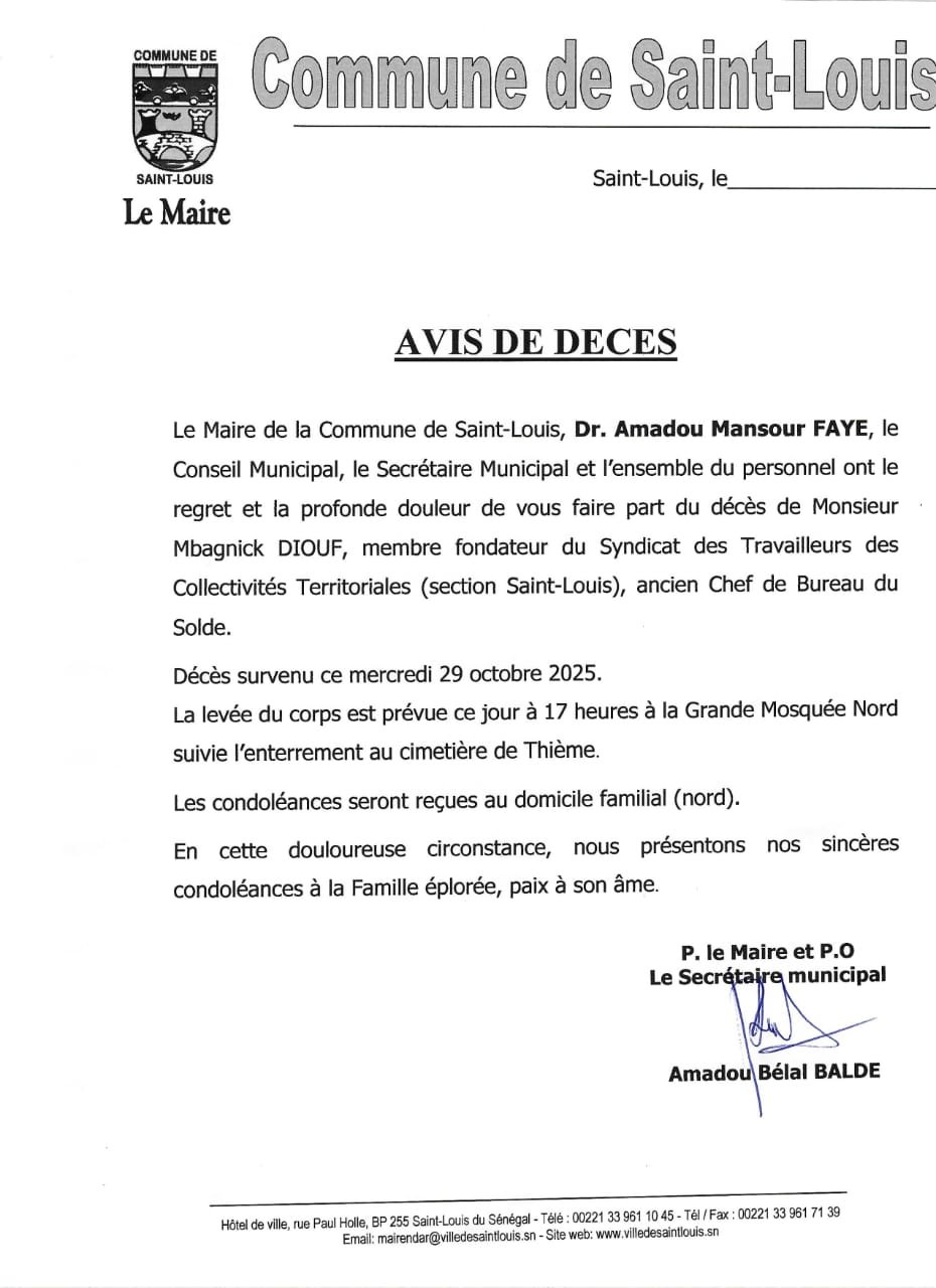 Saint-louis, 29 Oct (SL-INFO) – Navigation de l’article Football sénégalais en deuil : Ababacar Sadikh Sy, ex-président de la Linguère, n’est plus