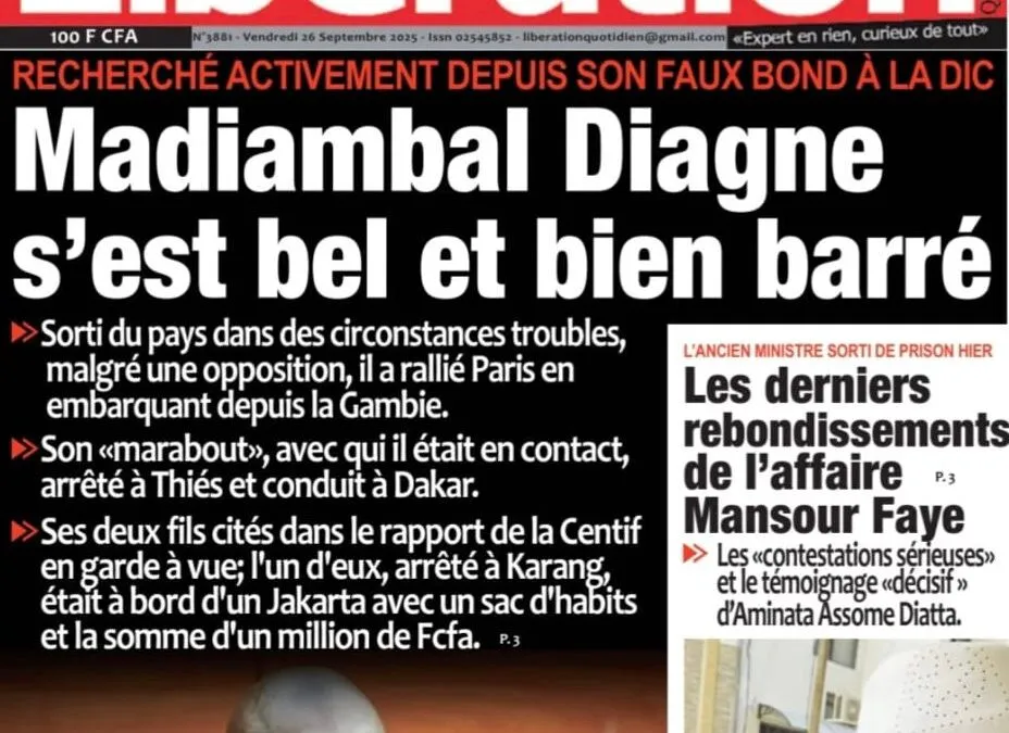Saint-Louis, 26 sept (SL-INFO) – Navigation de l’article Découvrez les Unes des journaux sénégalais du jeudi 25 septembre 2025 Madiambal Diagne en fuite : son marabout et deux de ses fils arrêtés
