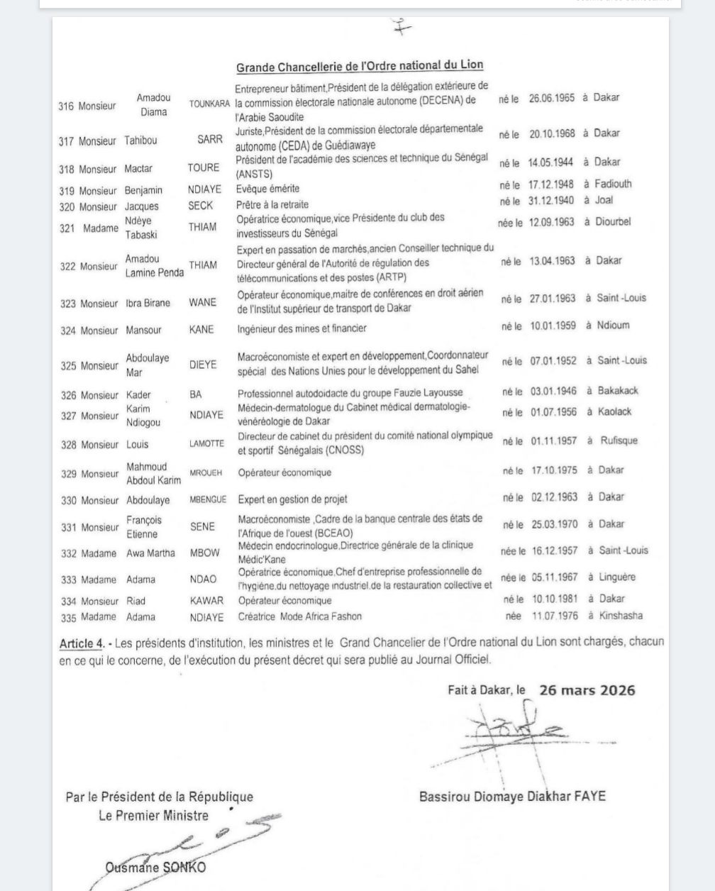 D’autres figures notables apparaissent dans ce décret, telles que l’évêque émérite Benjamin Ndiaye (n°319), l’ancien directeur de l’ARTP Amadou Lamine Penda Thiam (n°322), ou encore l’ingénieur des mines et financier Mansour Kane (n°324).