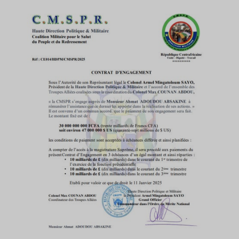 Parmi les documents trouvés on découvre un contrat, daté de janvier 2025, qui engage le CMSPR à verser 47 millions de dollars à Ahmat Adoudou Absakin après la prise de pouvoir, soulignant ainsi la confiance de Sayo en son accession imminente à la présidence. Des correspondances montrent des discussions sur le recrutement de combattants armés et des alliances avec des généraux centrafricains. En parallèle, une lettre d’un coordonnateur civique incite Sayo à renverser le régime de Faustin-Archange Touadéra.