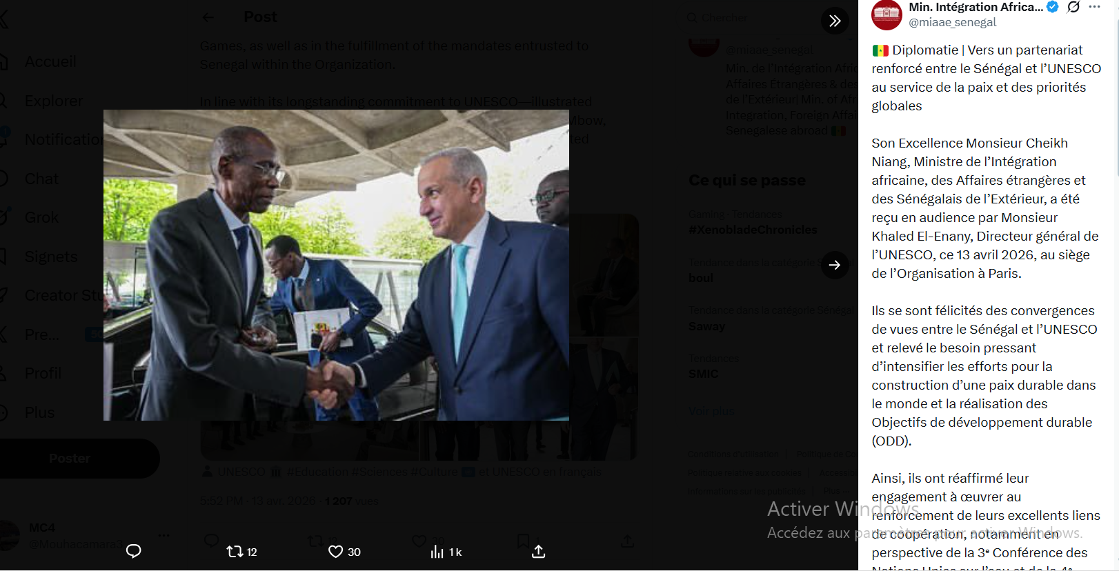 Dakar, 14 avril (SL-INFO) – En visite à Paris, le ministre de l’Intégration africaine, des Affaires étrangères et des Sénégalais de l’extérieur, Cheikh Niang, a été reçu en audience par le directeur général de l’UNESCO, Khaled El-Enany. À l’issue de cette rencontre, les deux responsables ont salué la convergence de vues entre le Sénégal et l’organisation onusienne, notamment sur les questions liées à la promotion de la paix et à la mise en œuvre des Objectifs de développement durable (ODD). Ils ont insisté sur l’urgence d’intensifier les efforts à l’échelle internationale pour répondre efficacement aux défis globaux.