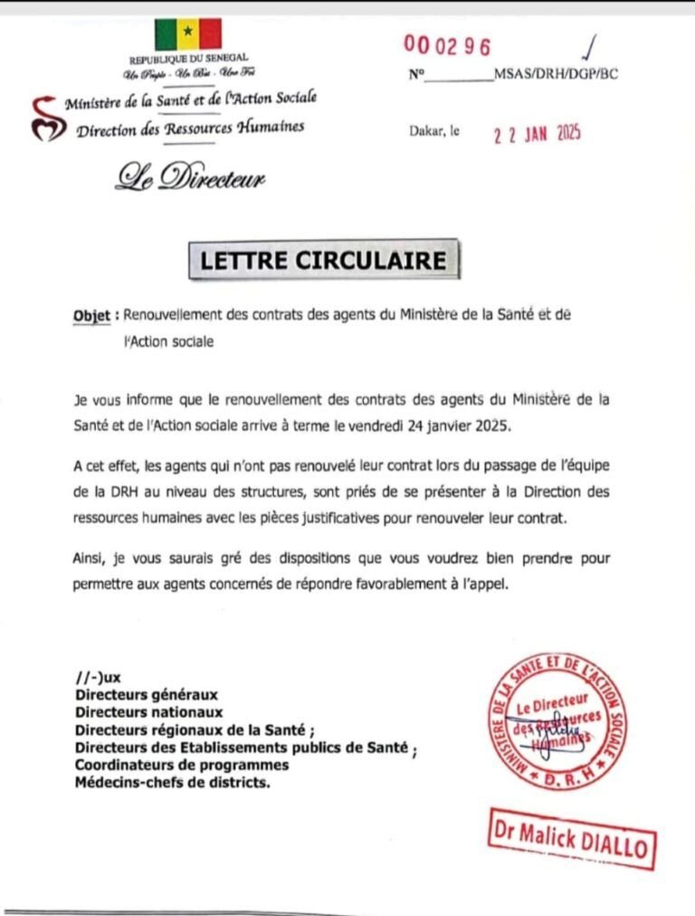 Saint-Louis, 08 Fév (SL-INFO) – Dans une lettre ouverte adressée au Président Bassirou Diomaye Faye, Ansoumana DIONE, Président de l’Association Sénégalaise pour le Suivi et l’Assistance aux Malades Mentaux (ASSAMM), alerte sur une situation préoccupante à la Direction Générale de l’Action Sociale. Selon lui, le Directeur Général Boucar DIOUF a pris des mesures abusives en refusant de signer les certificats administratifs des agents, entravant ainsi leur droit au renouvellement de contrat. Cette décision intervient malgré une lettre circulaire du Directeur des Ressources Humaines, le Docteur Malick DIALLO, qui avait clairement précisé que les agents ayant raté la date limite du 24 janvier 2025 pouvaient renouveler leurs contrats avec les pièces justificatives.