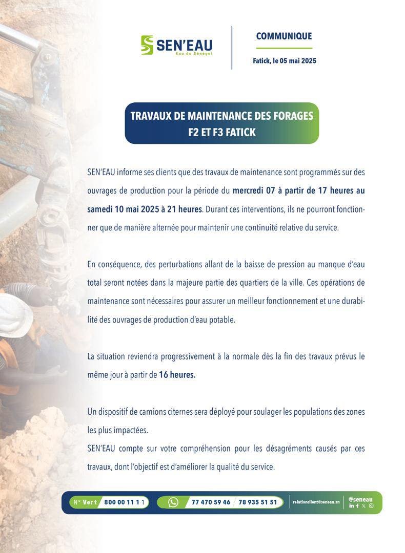 Fatick, 7 mai (SL-INFO) – La société SEN’EAU informe ses clients de la ville de Fatick que des travaux de maintenance sont en cours sur les forages F2 et F3, dans le cadre d’un programme visant à améliorer la qualité et la durabilité de la production d’eau potable. Ces interventions se déroulent du mercredi 7 mai 2025 à 17 heures jusqu’au samedi 10 mai à 21 heures.