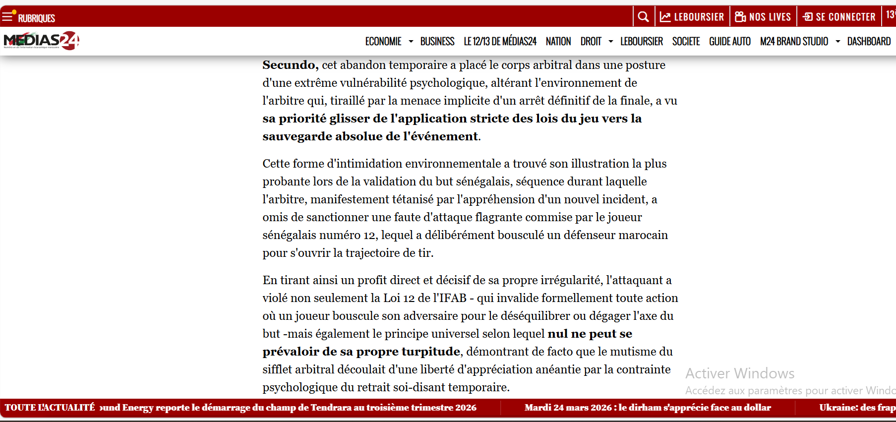 « Cet abandon temporaire a placé le corps arbitral dans une posture d’une extrême vulnérabilité psychologique, altérant l’environnement de l’arbitre qui, tiraillé par la menace implicite d’un arrêt définitif de la finale, a vu sa priorité glisser de l’application stricte des lois du jeu vers la sauvegarde absolue de l’événement. Cette forme d’intimidation environnementale a trouvé son illustration la plus probante lors de la validation du but sénégalais, séquence durant laquelle l’arbitre, manifestement tétanisé par l’appréhension d’un nouvel incident, a omis de sanctionner une faute d’attaque flagrante commise par le joueur sénégalais numéro 12, lequel a délibérément bousculé un défenseur marocain pour s’ouvrir la trajectoire de tir », écrit Belhoucine sur Medias24.