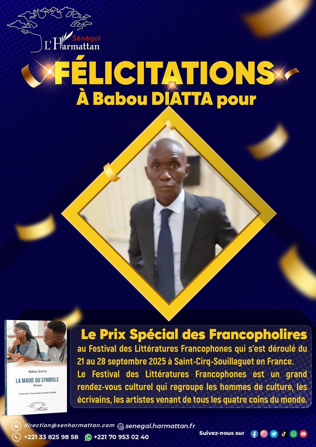 Dakar, 17 Oct (SL-INFO) – L’écrivain sénégalais Babou Diatta a été honoré du prix spécial des Francopholires pour son second ouvrage « La magie du symbole », lors du prestigieux Festival des Littératures Francophones, qui s’est tenu du 21 au 28 septembre 2025 à Saint-Cirq-Souillaguet, en France.