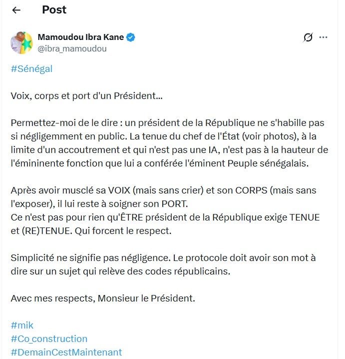 Mamoudou Ibra Kane a ensuite invité le Président Faye à retravailler son accoutrement. « Après avoir musclé sa VOIX (mais sans crier) et son CORPS (mais sans l’exposer), il lui reste à soigner son PORT. Ce n’est pas pour rien qu’ÊTRE président de la République exige TENUE et (RE)TENUE. Qui forcent le respect. Simplicité ne signifie pas négligence. Le protocole doit avoir son mot à dire sur un sujet qui relève des codes républicains. Avec mes respects, Monsieur le Président », termine Mamoudou Ibra Kane.