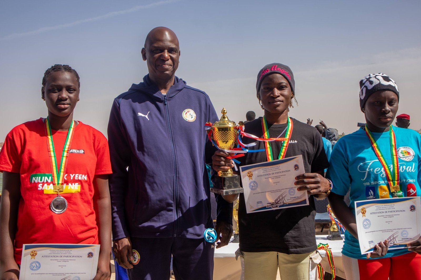 Peut être une image de texte qui dit ’チに LIQUERESIONALE DESANTLON5 市 CHAMPIONNATS NATIONAUX DE AO- KAYAK ET AVIRON CANAL+ cfao MJS 生民料 GÉNÉRALMBAYECISE RALMBAYE Chef d'état Major Armées DAWR M.MALICKNDIAYE NDIAYE Président l'assemblée Nationale 24 ET 24ET25 25 田 JANVIER JANVIER202 2026 MANSOUR FAYE Maired Mairedelaville villed Saint louis HENRY HENRYJAY JAY SINDONE Saint Louis’