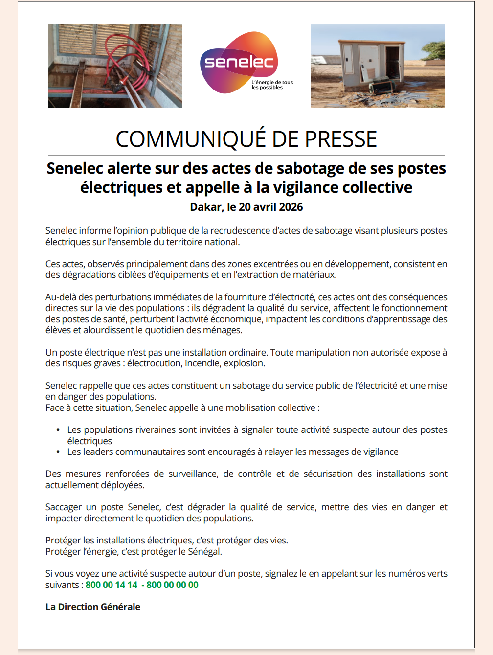 Les populations sont invitées à signaler toute activité suspecte à proximité des infrastructures électriques en appelant les numéros verts mis à disposition : 800 00 14 14 ou 800 00 00 00. Comme le souligne avec force le communiqué : « Protéger les installations électriques, c’est protéger des vies. Protéger l’énergie, c’est protéger le Sénégal. »