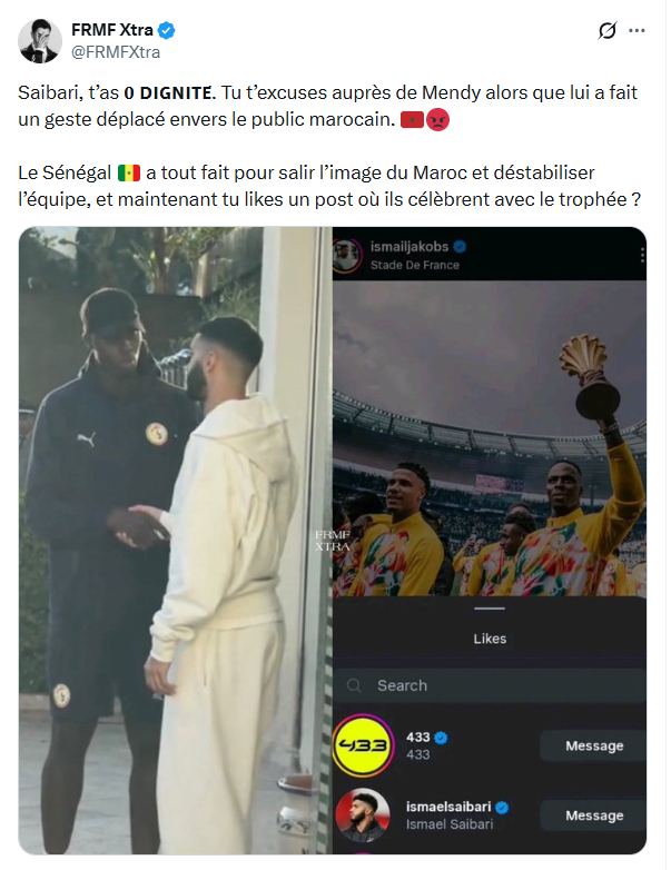 Un post appuyé par plusieurs autres reprochant à Ismail Saibari son comportement depuis la fin de la CAN 2025. Certains l’ont même critiqué de s’être excusé auprès d’Edouard Mendy le lendemain de la finale, pour l’affaire des serviettes.
