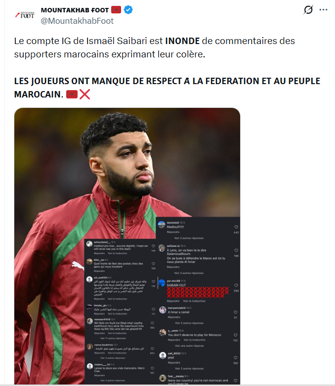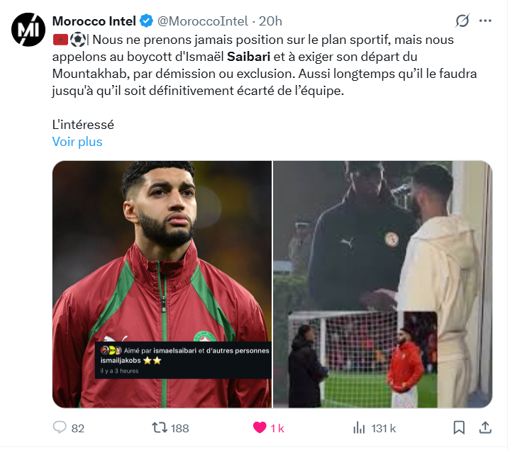 Morocco Intel, page numérique marocaine, a publiquement appelé à son exclusion de la sélection. « Nous ne prenons jamais position sur le plan sportif, mais nous appelons au boycott d’Ismaël Saibari et à exiger son départ du Mountakhab (tanière du Maroc), par démission ou exclusion. Aussi longtemps qu’il le faudra jusqu’à qu’il soit définitivement écarté de l’équipe », écrit le média.